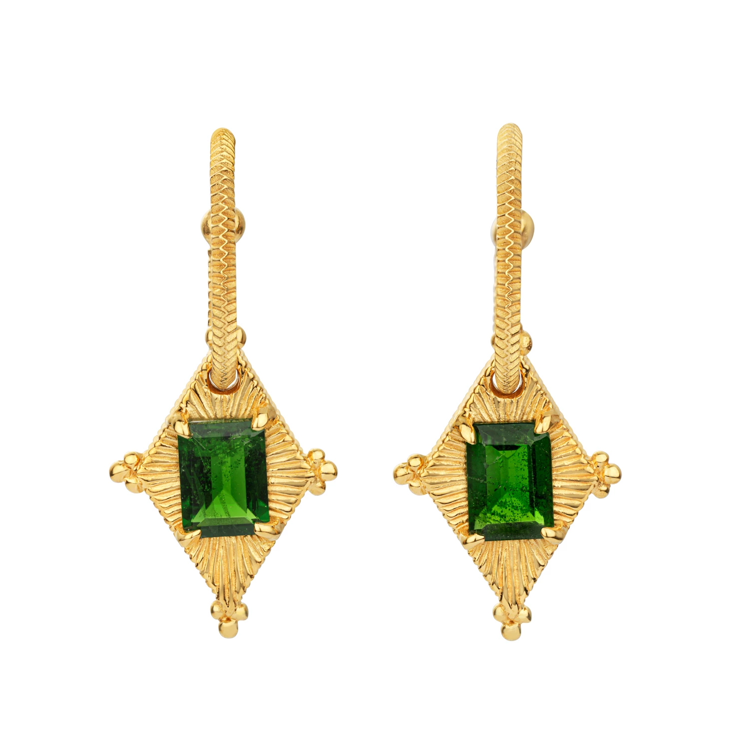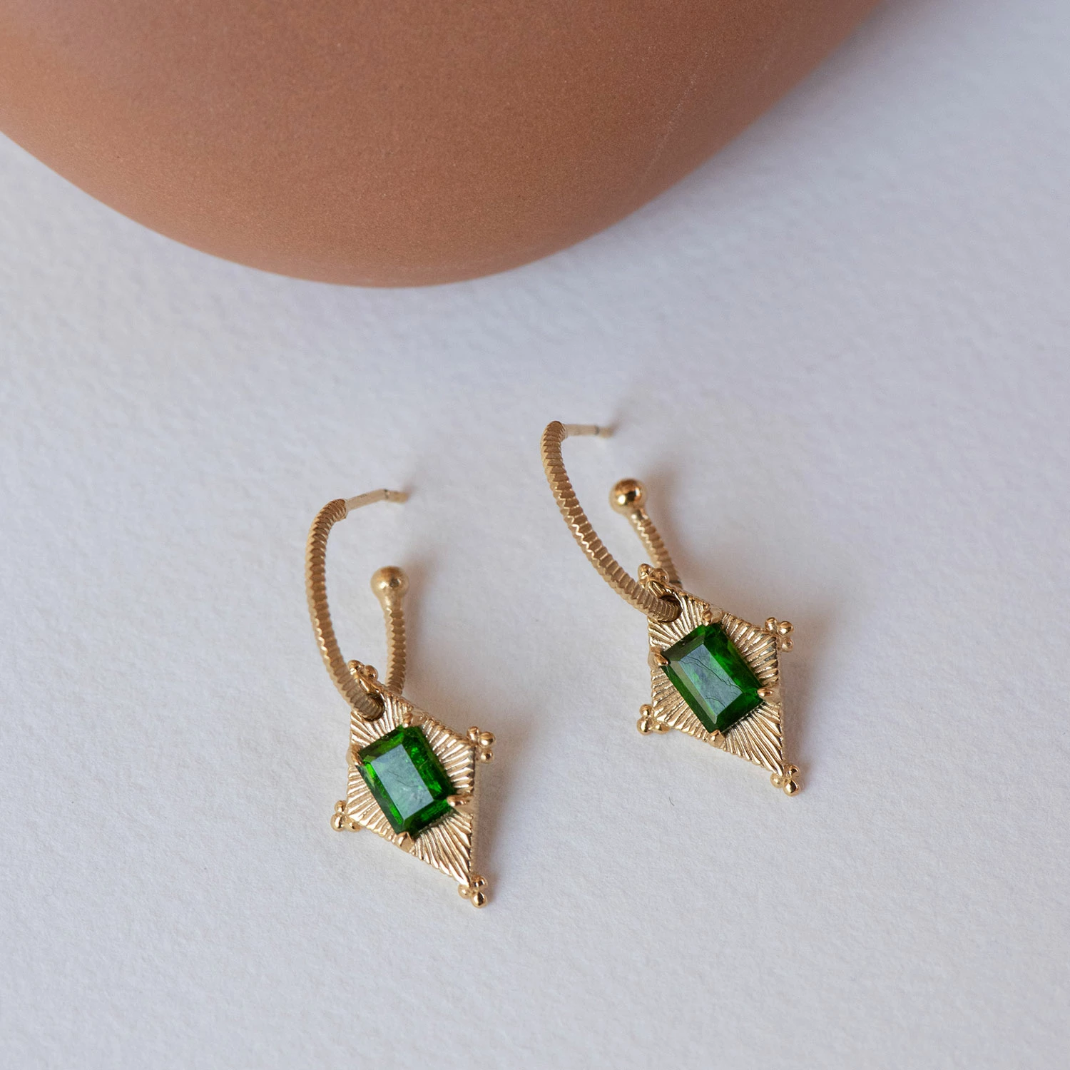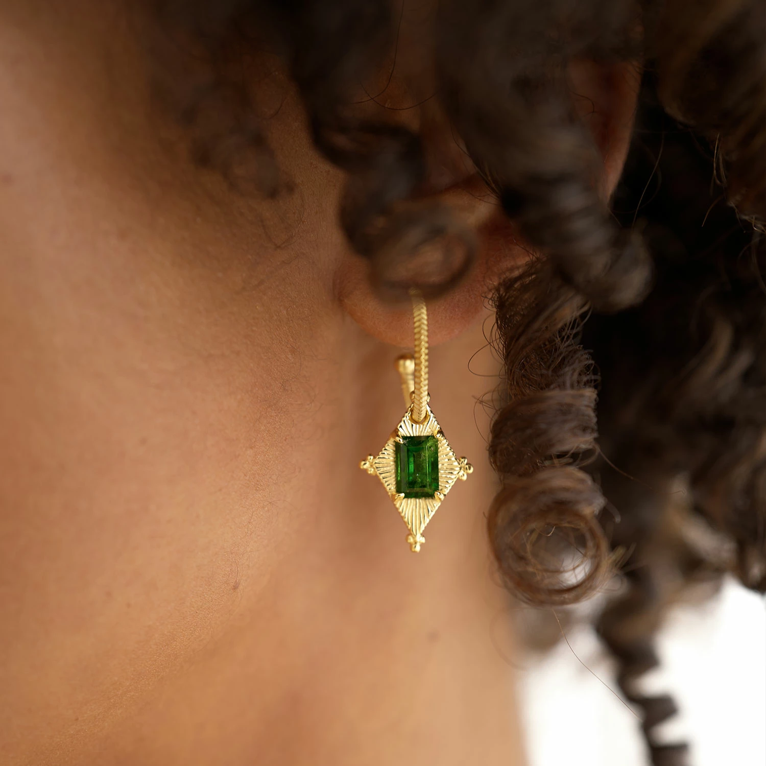 The beautiful straight lines defining the emerald cut Chrome Diopside are counter balanced by unique, hand engraved detailing.