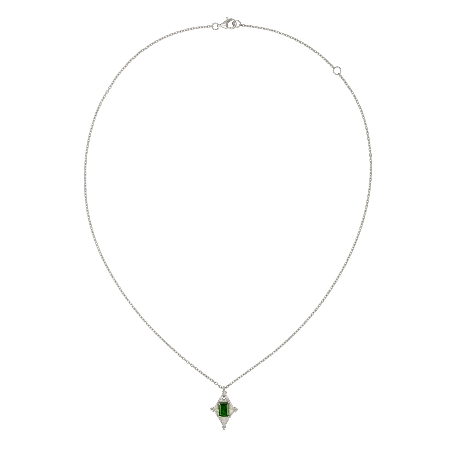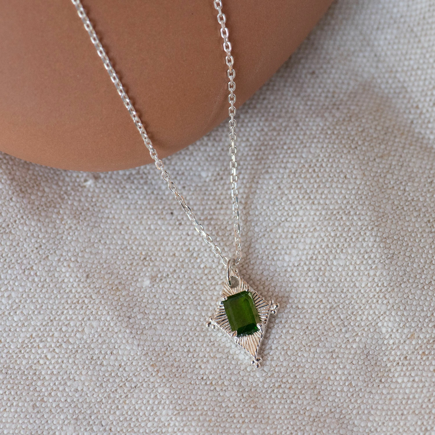 The texture in the hand engraving detail allows the Chrome Diopside stone to shine.