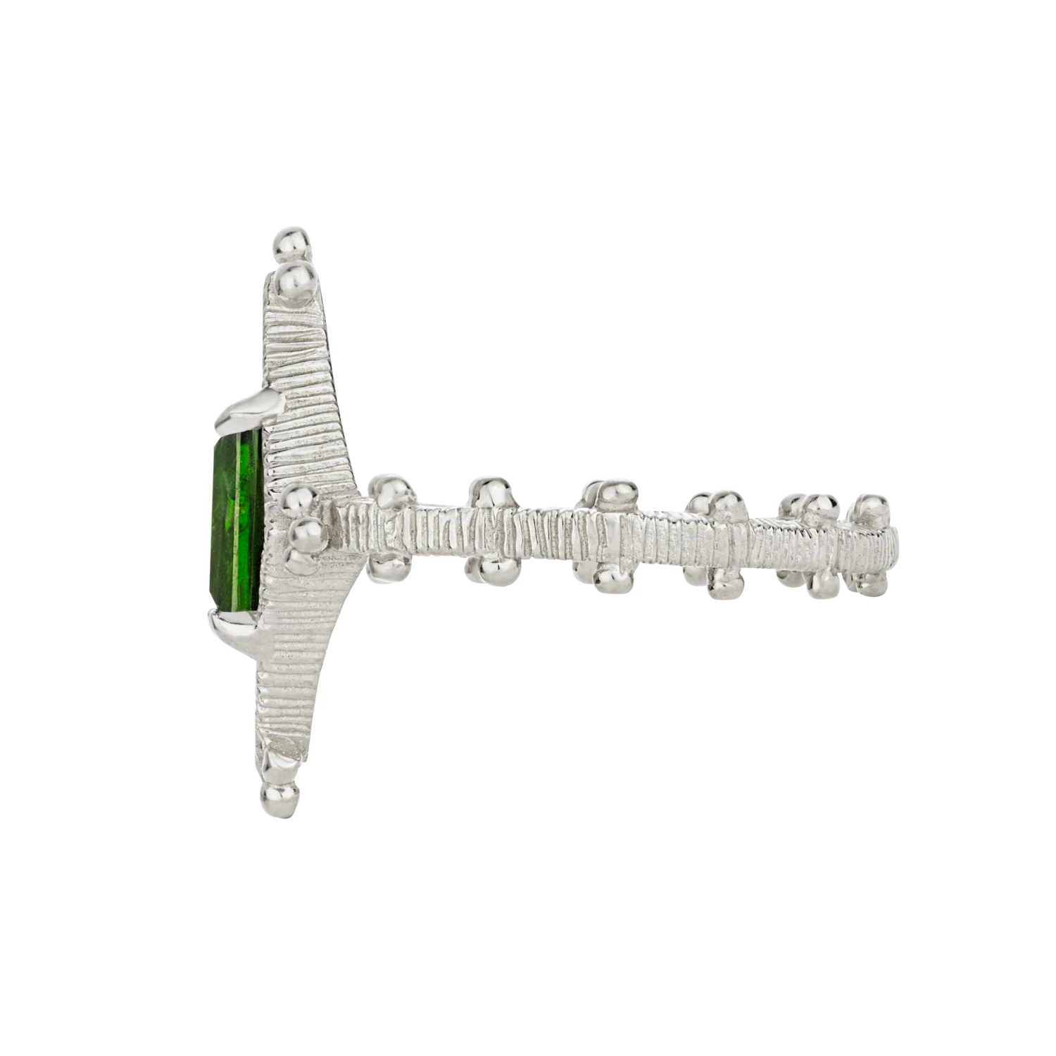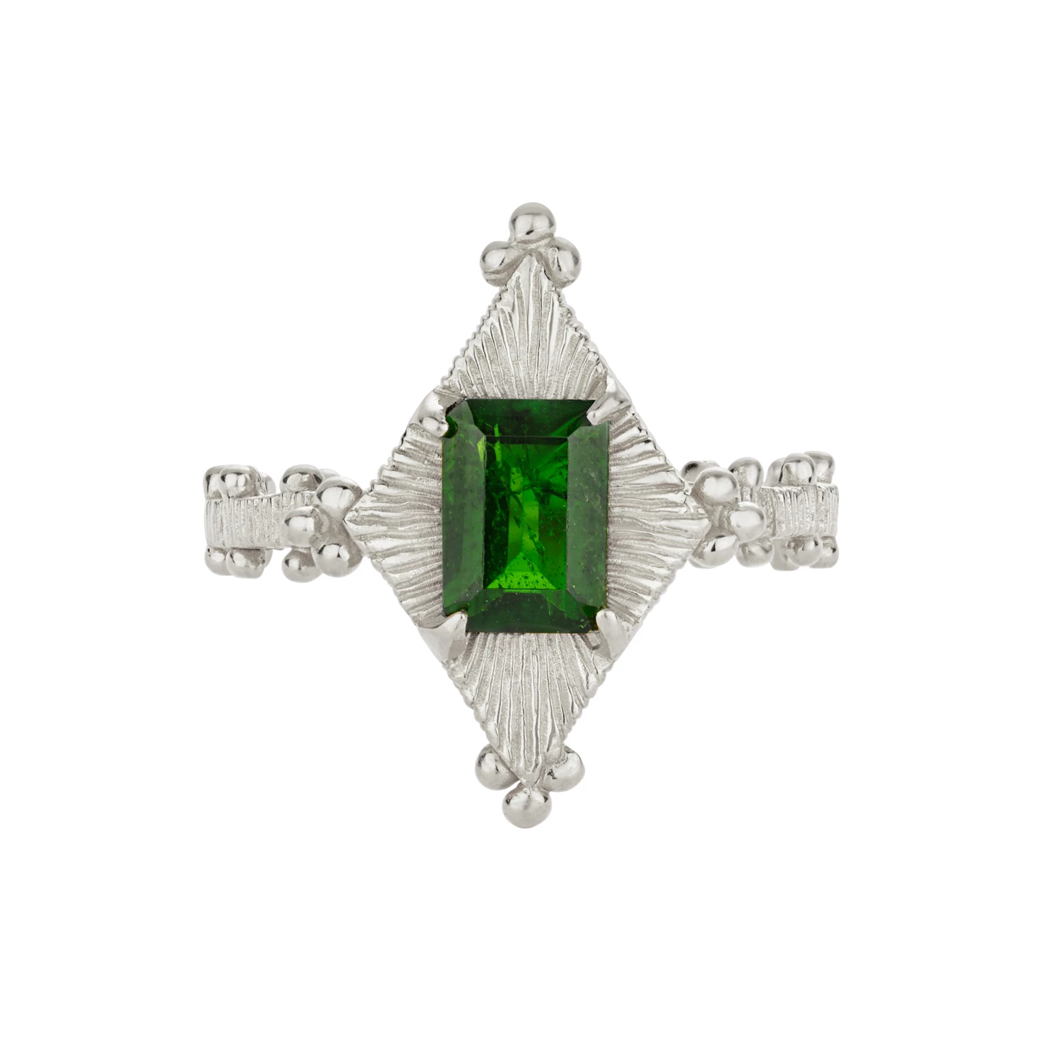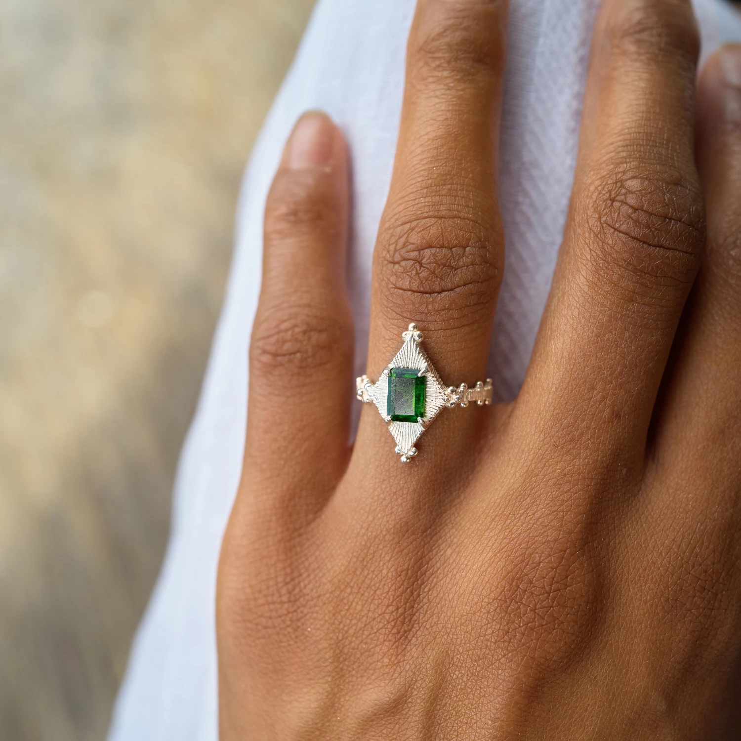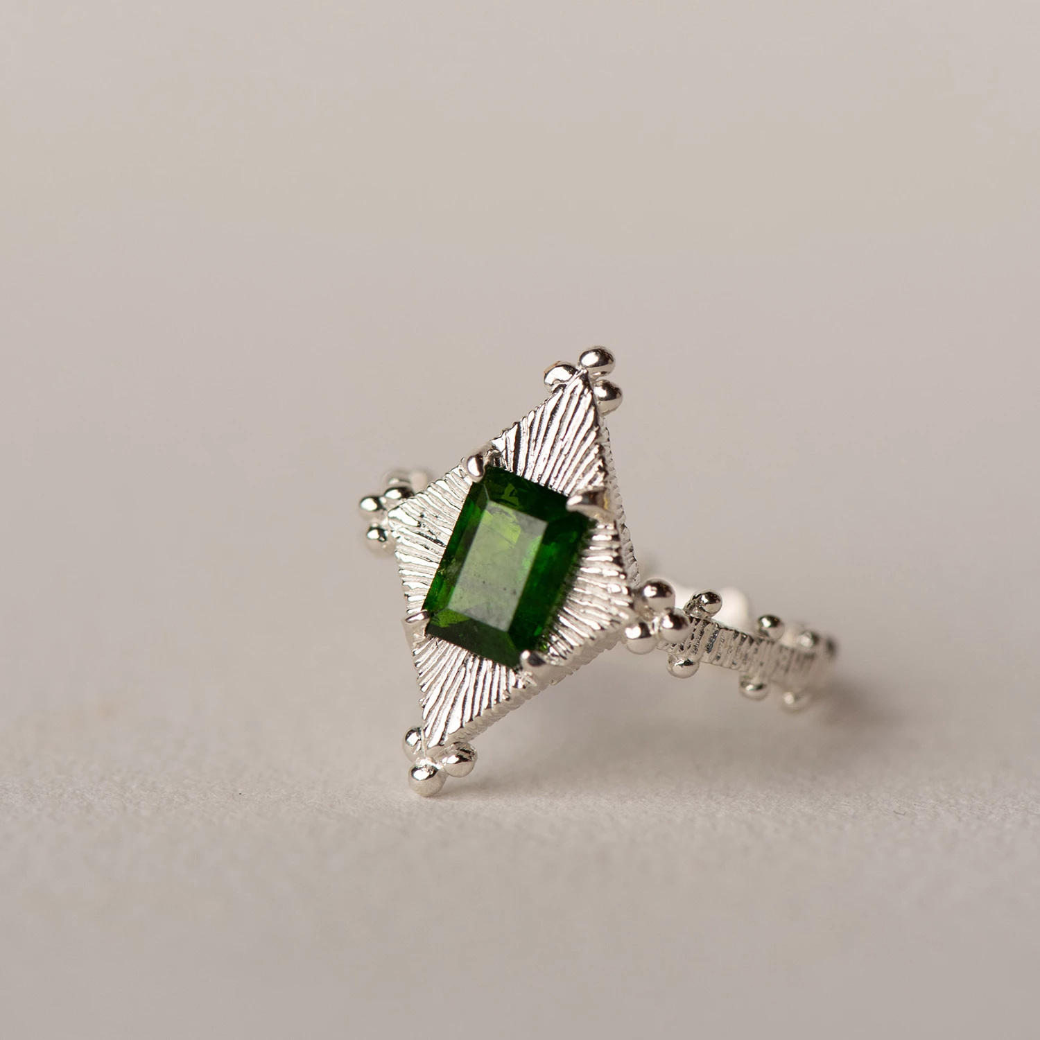 The beautiful straight lines defining the emerald cut Chrome Diopside are counter balanced by the unique detailing on the hand engraved band.