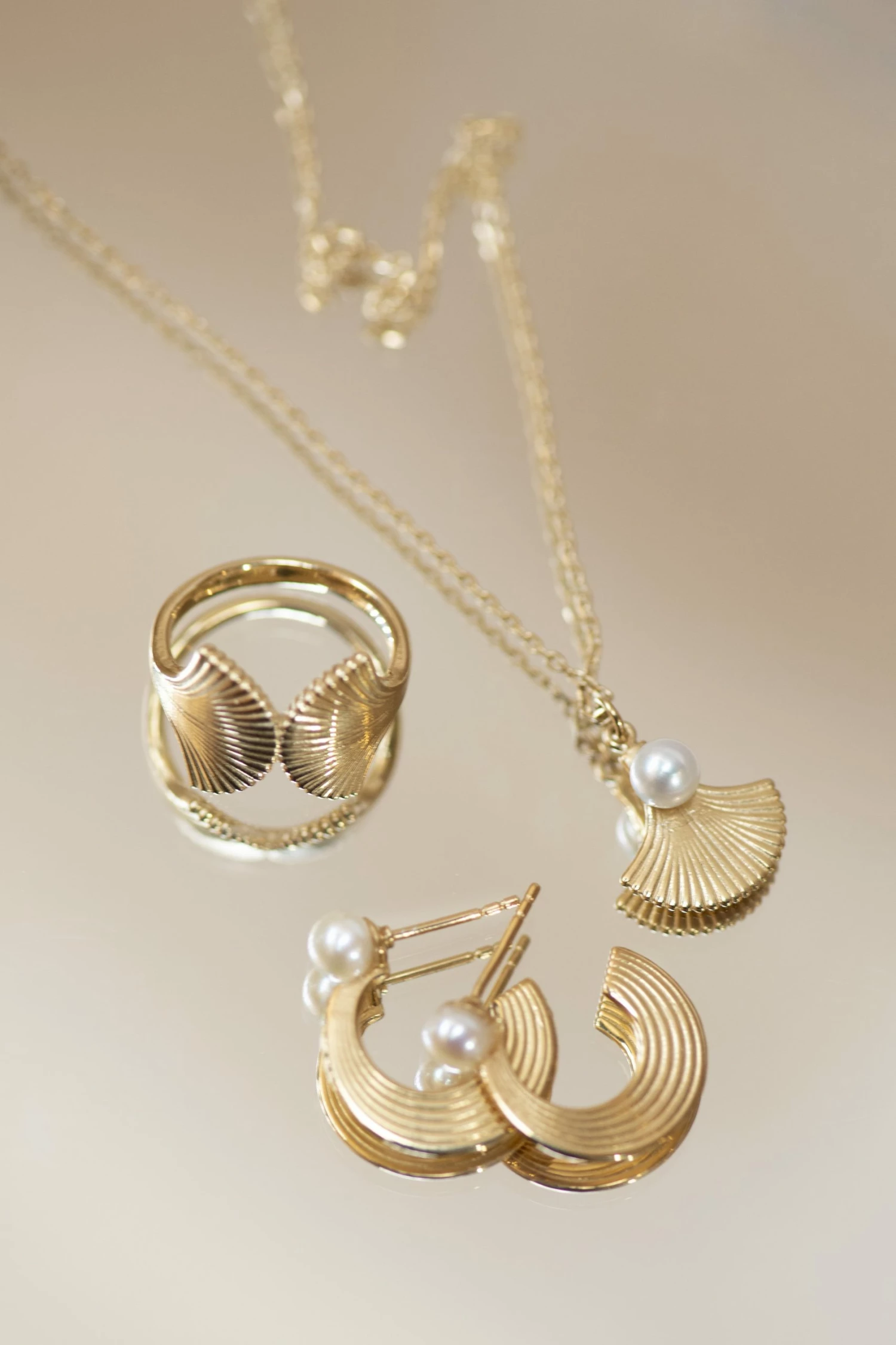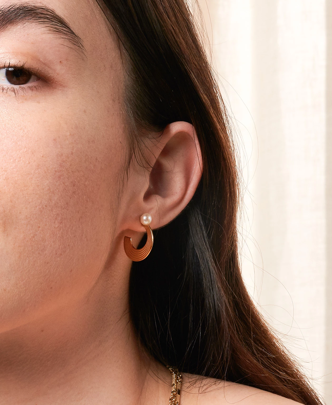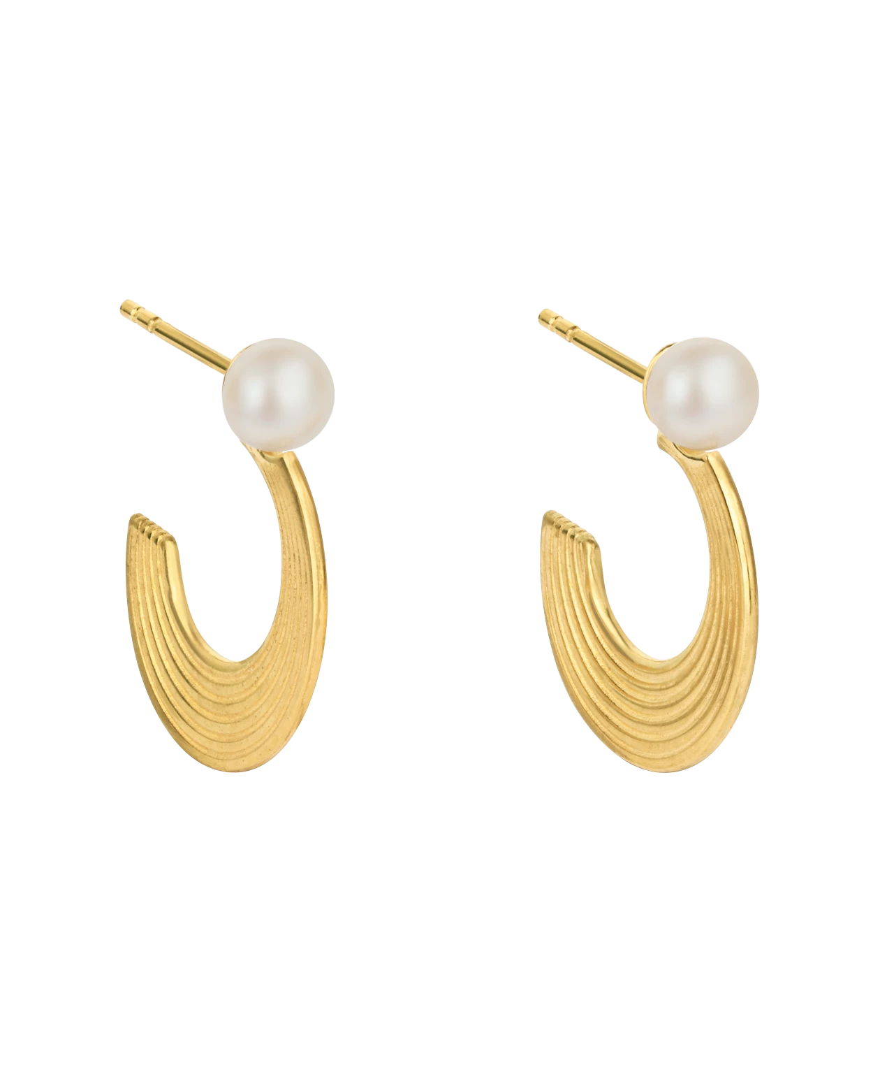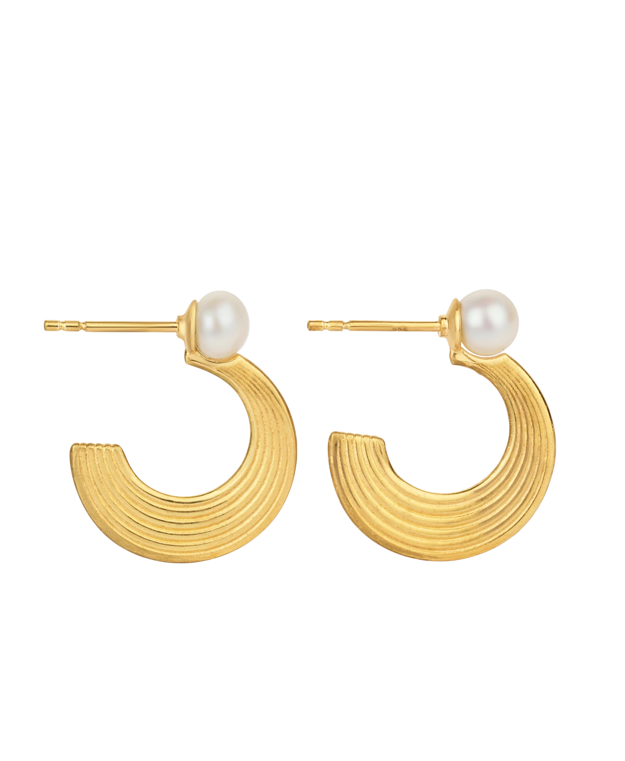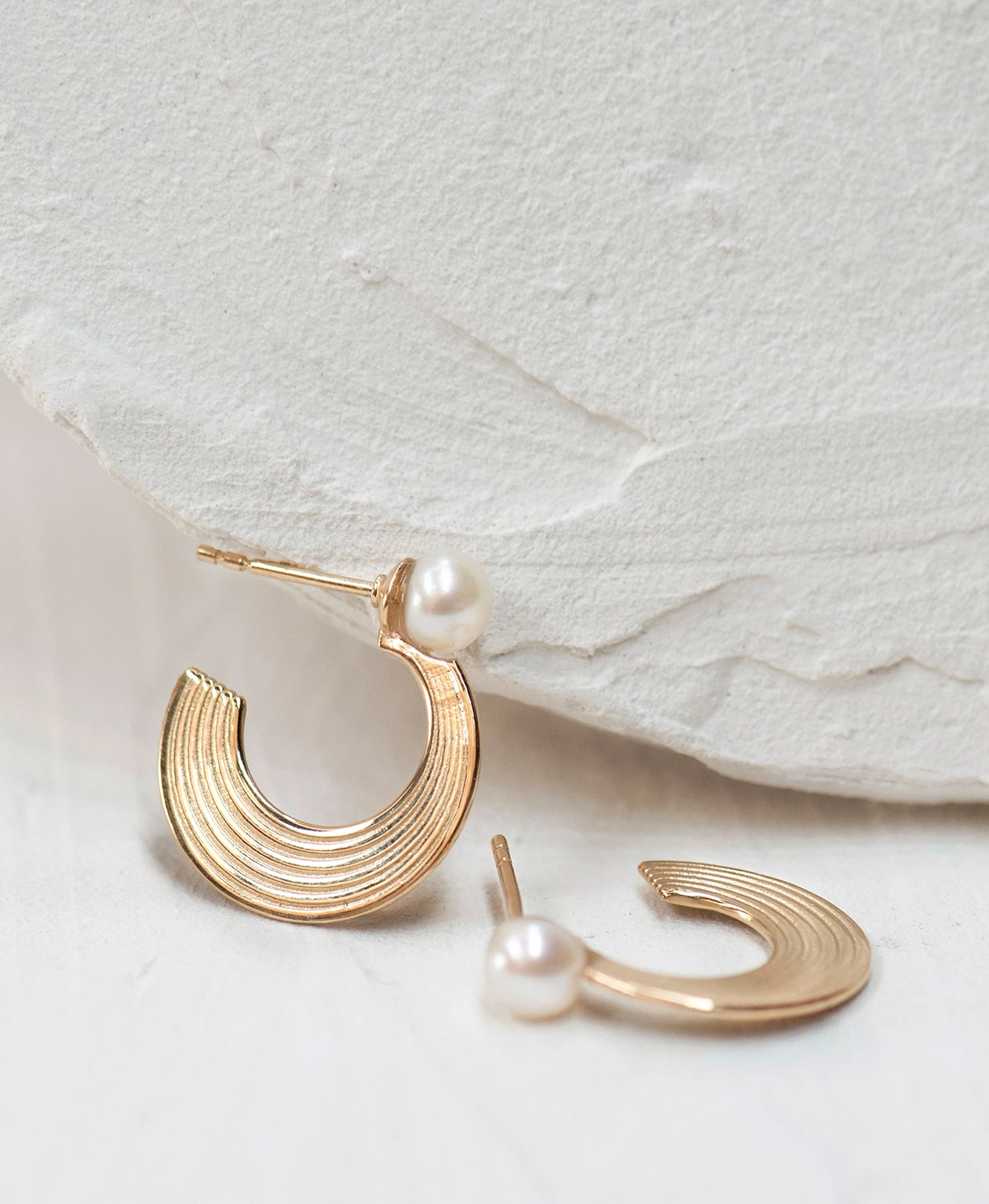 The Delphina Hoops remind us of the ocean; the way that water ripples and flows and the linear textures we find in seashells.The fluid lines are complimented by a delightful inset pearl.