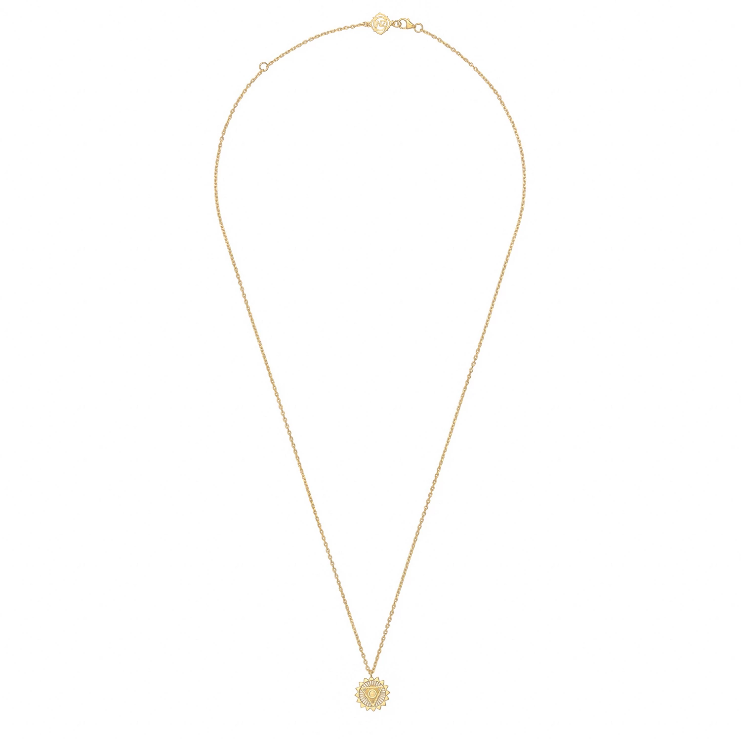 The fifth Chakra symbol, radiates on this pendant that can be worn alone or layered with the Mala or Surya Necklace.