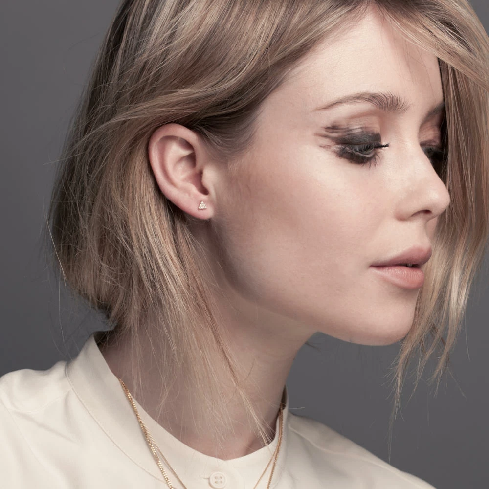 Zoe and Morgan Mini Diamond Pyramid Single Stud Earring. The pyramid represents the sense of harmony and unity within ourselves and with the environment to which we aspire. Sold as a single stud.
